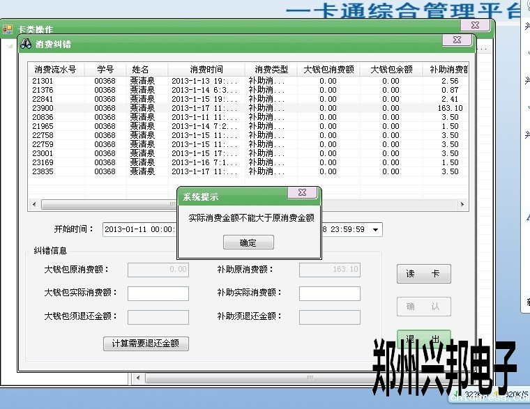答:如果实际消费金额处比原来 的消费金额大肯定会提示这个错误,如果提示这种错误 请重新输入正确金额即可(像这种情况一般情况下是要知道真正的应该刷客户多少钱的,然后在实际消费金额处输入实际应该消费的金额之后()-确定即可)