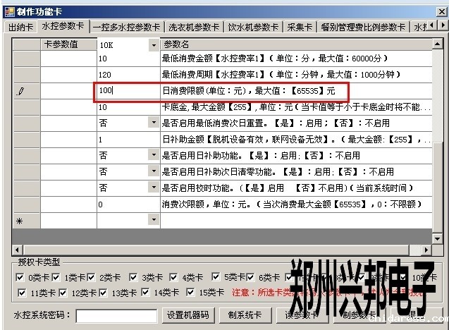 2)打开软件 制卡中心-功能卡制作-水控参数卡中的日限额,输入要设置的值,以元为单位,如下图所示,代表100元,最大可设置到65535元,设置好后点击制参数卡即可;