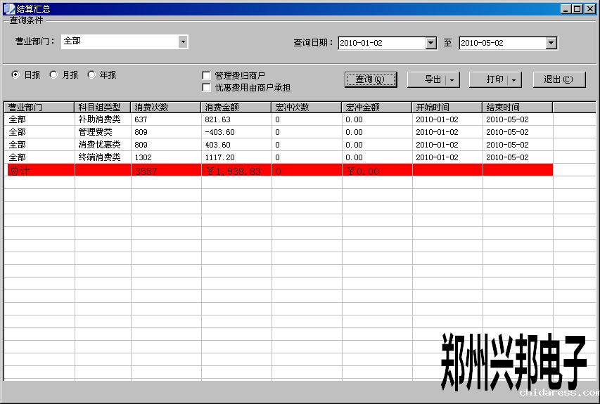 结算汇总表:查询各营业部门日,月,年汇总报表,此表需要结算才能查看。窗口有两个复选框架,如下图所示: