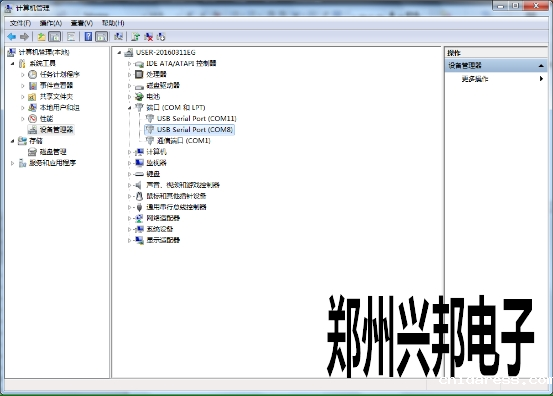 1、单击计算机—单击右键—管理—设备管理—端口。找到所用usb线端口。如下图: