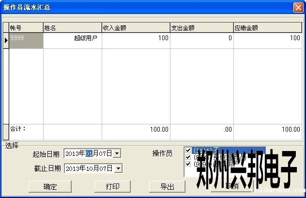 4.查询操作员账户汇总是在操作员流水汇总表中,可根据日期查询到收入、支出及应缴的金额。
