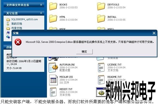 只能安装客户端,不能安装服务器。而我们软件所需要的是客户端和服务器都得有。
