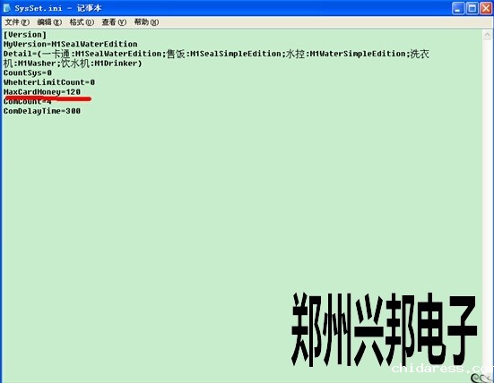 电脑桌面上找到485售饭机软件图标,然后光标停在此软件图标上右击--属性--查找根目录,点开后打开软件文件夹,也就是找到带有软件图标的文件夹,然后找到SYSSET.INI此文件,双击打开,把MAXCARDMONEY=XX,更改成自己所需要的即可,如下图:有一卡通,售饭,水控,洗衣机,饮水机等相关的中文数字,现在只需要把maxcardmoney=120,此时卡上总额最多只能存款为120,超过此金额就无法存款。