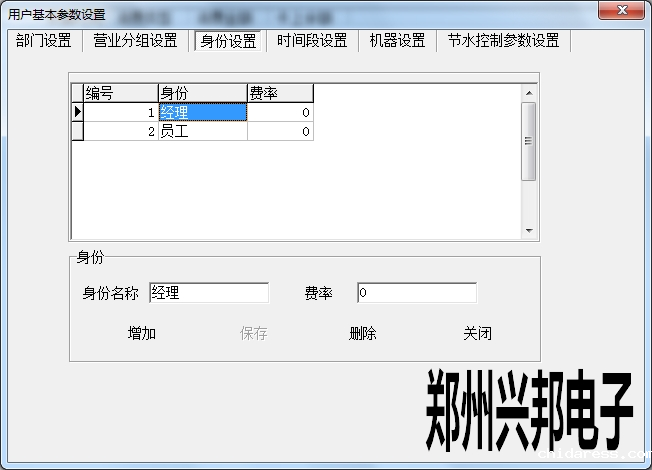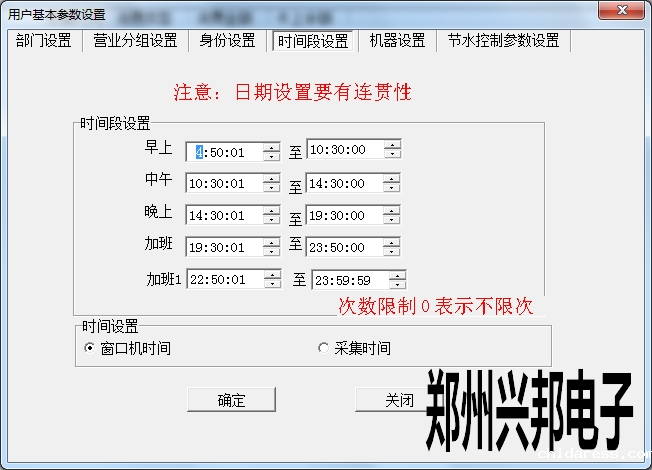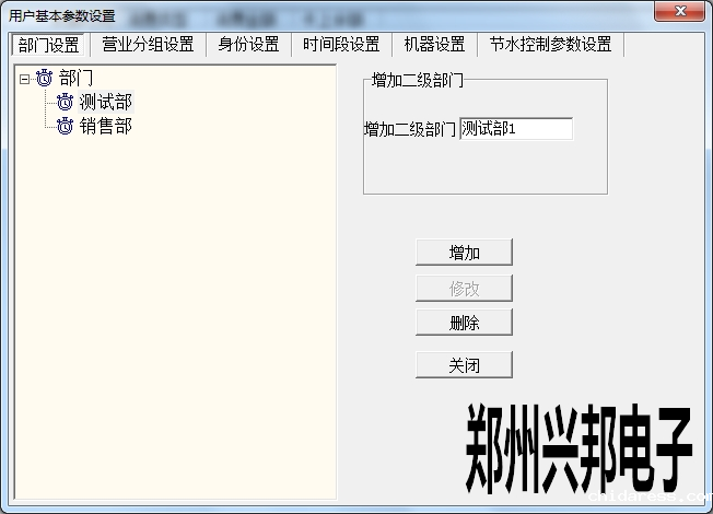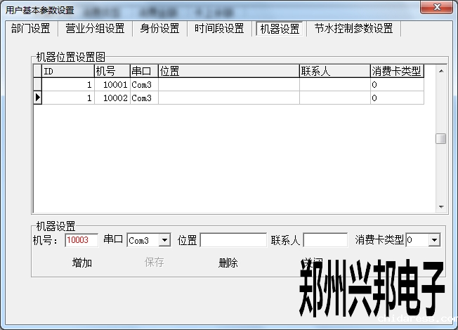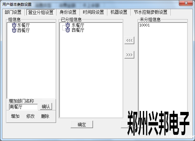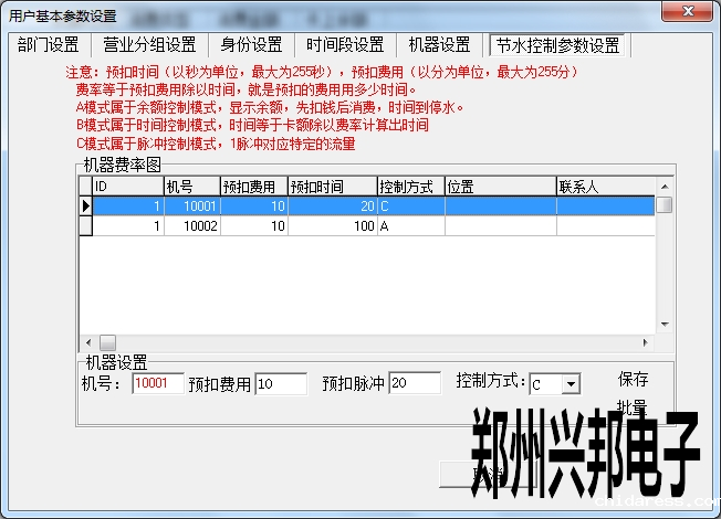 在使用兴邦一卡通平台用户基本参数设置中有部门设置、营业分组设置、身份设置、时间段设置、机器设置、节水控制参数设置。下面依次为其说明。
