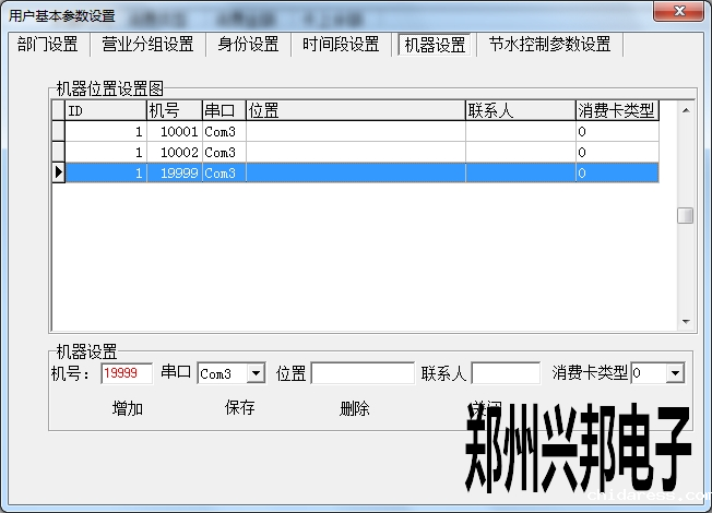 在机器设置中可以添加机器,设置机器号、串口以及消费卡类型,位置、联系人可以选填。其中设置机器号必须输入5位,开头为1,最大可设置为19999.串口是指通讯器连接电脑的端口号,此处的串口号选择不正确的话会导致机器不通讯。