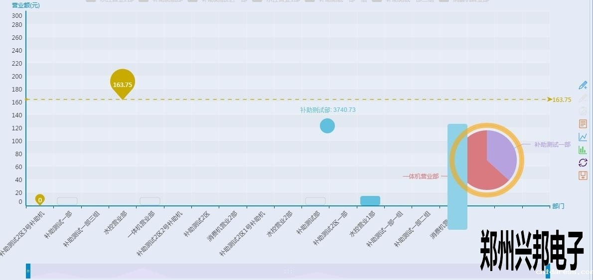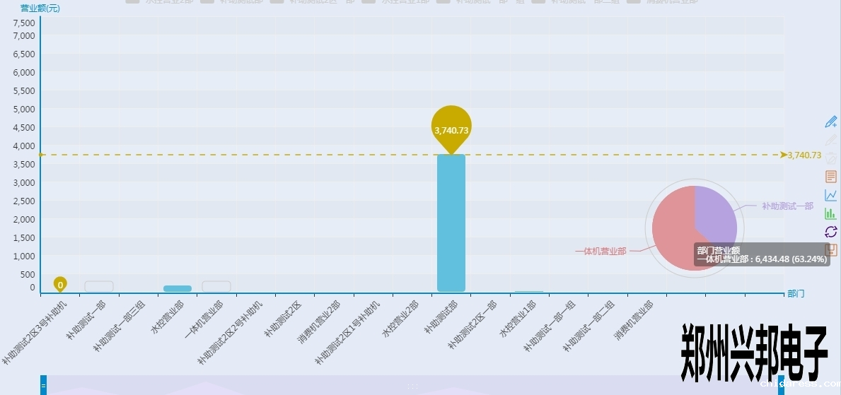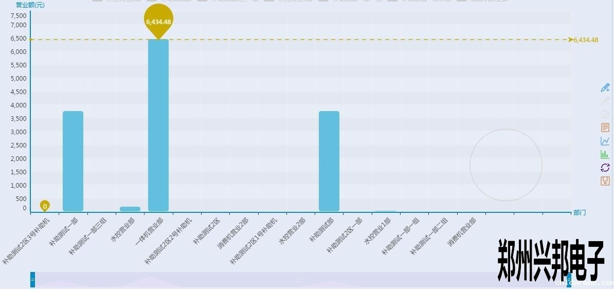 看上起跟终端营业图表差不多,但是有没有注意到有一根和终端营业分析图不一样样色的虚线?这是这个图表里面的最大值,也就是营业额最高的部门,当然下面的工具条也可以像终端营业分析图一样的滑动来看某个具体的柱图,不过你又没有注意到后面还有一个圈?对那是一个圈圈,有什么用呢?来看一下下面的图形: