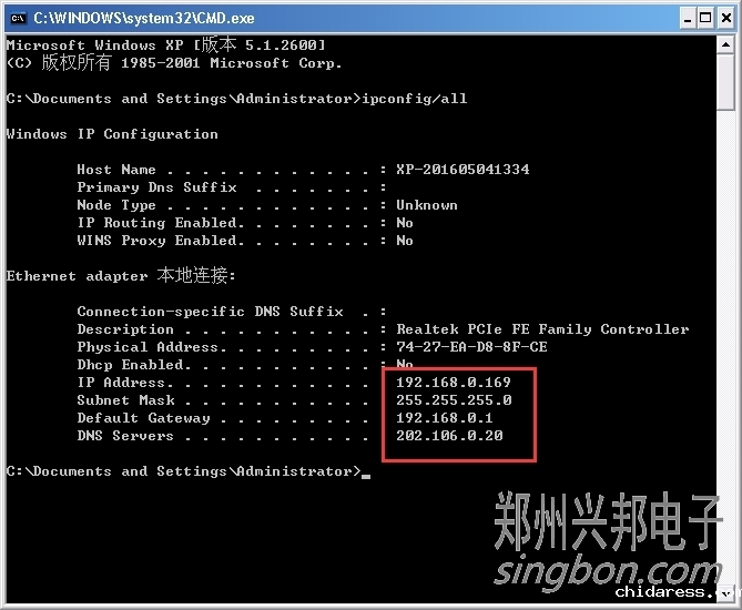 4.我们可以看到红色方框内就是我们所要查看的IP地址、网关、和dns了。